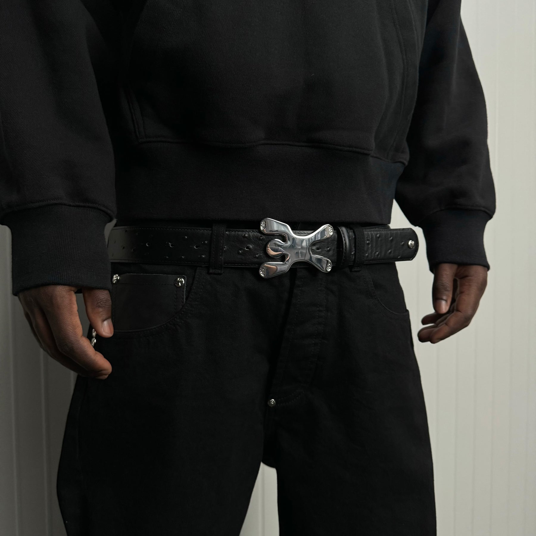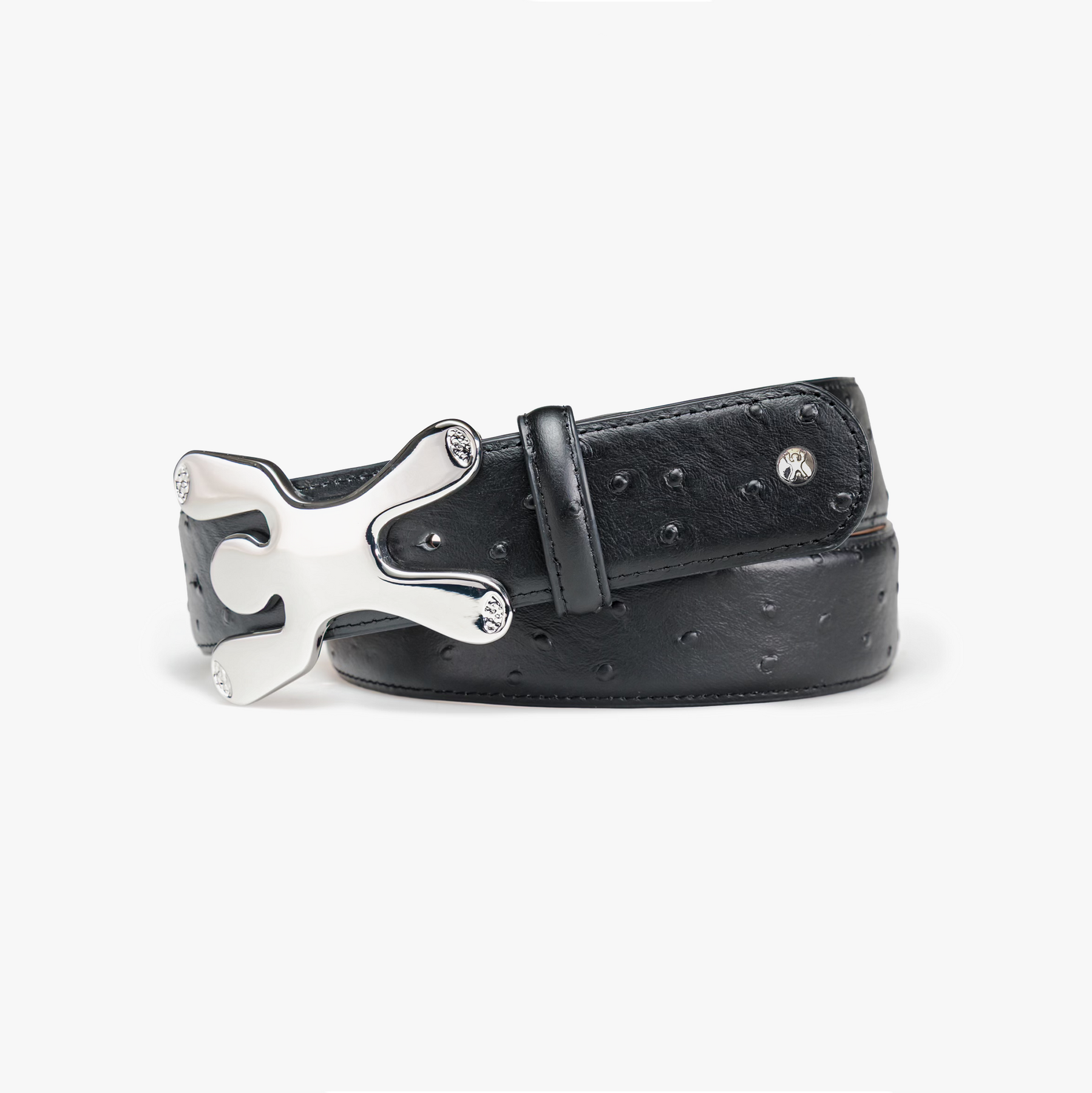 100% leather ostrich patterned belt with custom steel MASKOT buckle.